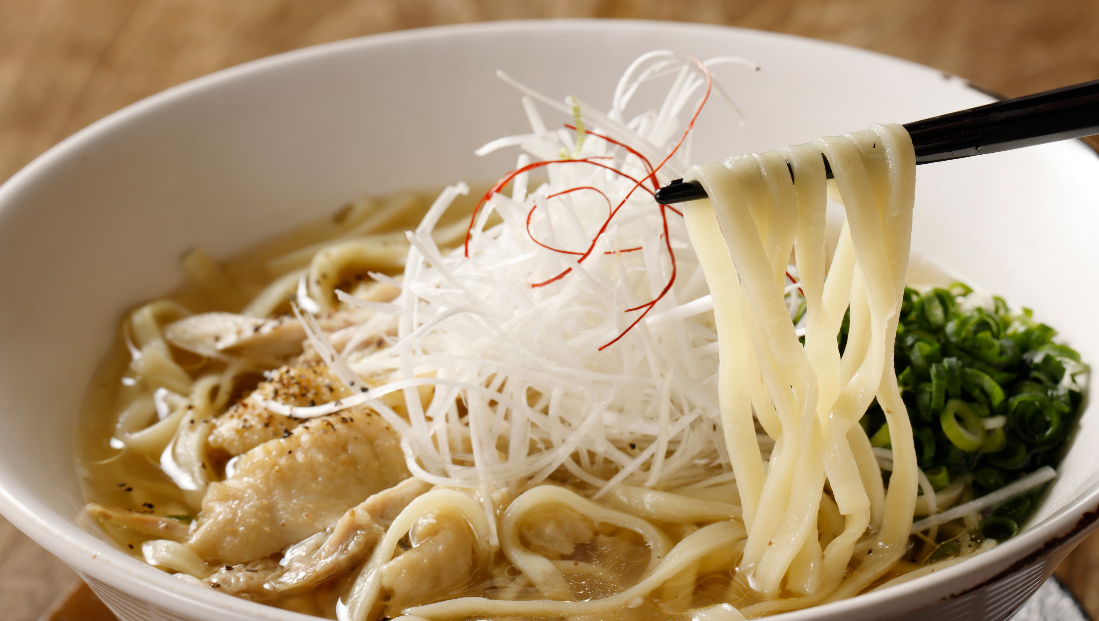 特注の平打ち玉子麺が特別感を演出し、麺が泳ぐ黄金色のスープは冠地鶏のガラに門外不出の特製タレを加え、じっくり時間を掛け煮込んだもの。
