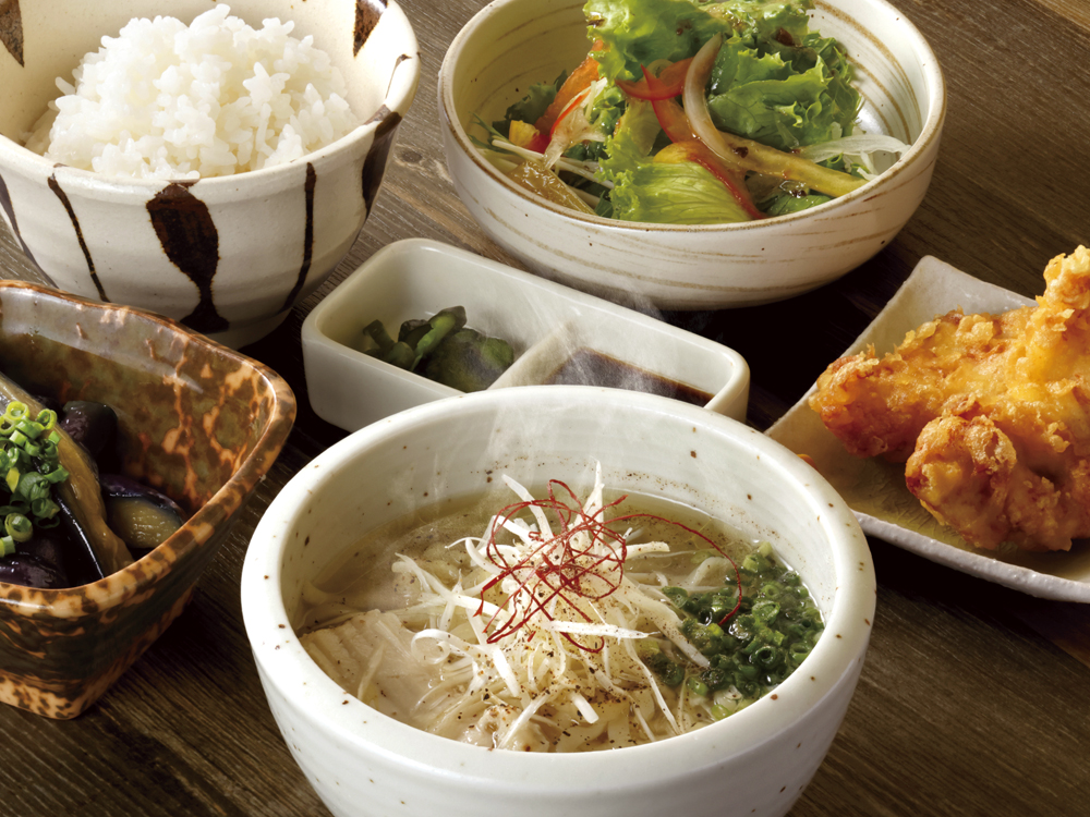 [ミニ鶏そば・ご飯・とり天・小鉢・サラダ・お新香]