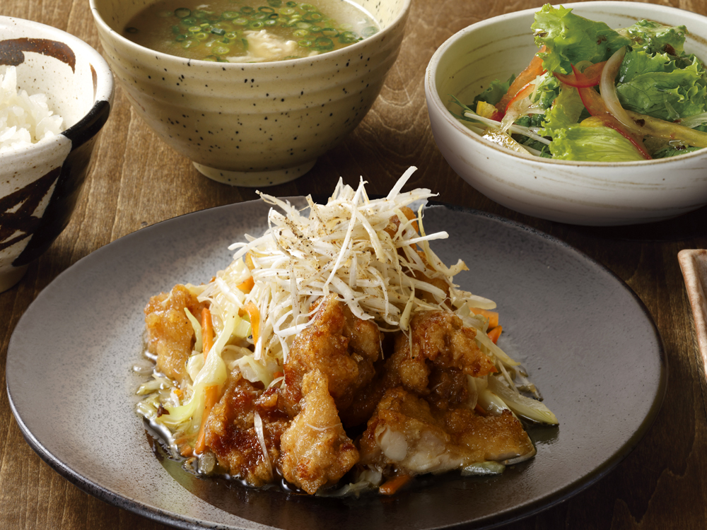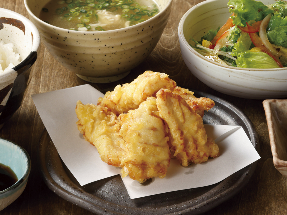 [とり天・ご飯・鶏ガラスープのお味噌汁・サラダ・お新香]