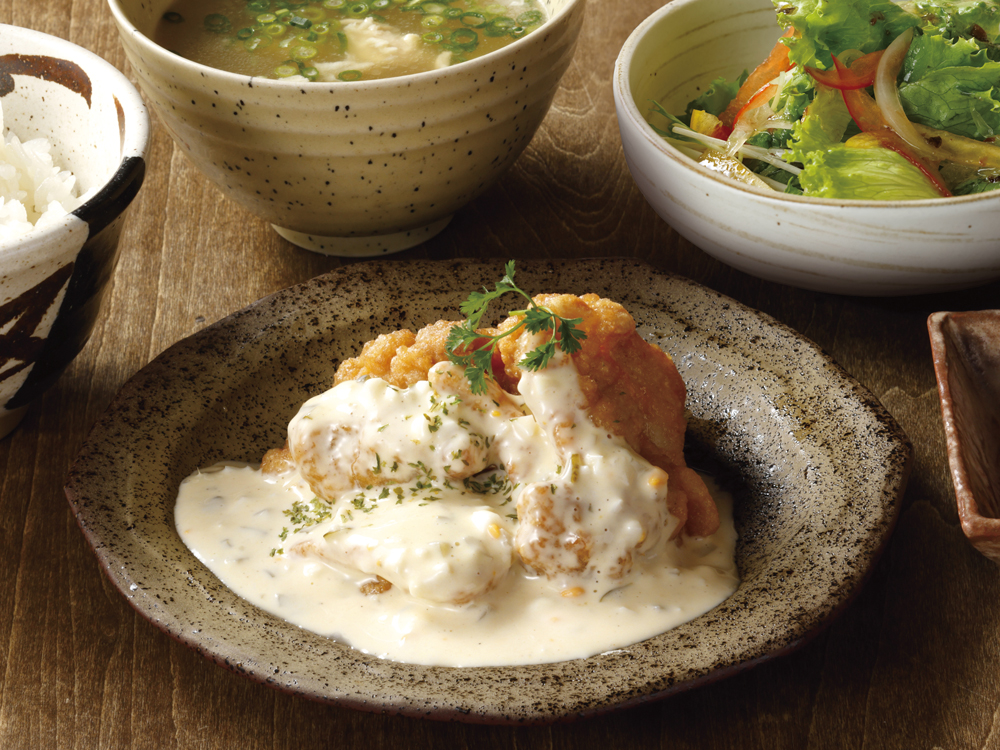 [チキン南蛮・ご飯・鶏ガラスープのお味噌汁・サラダ・お新香]