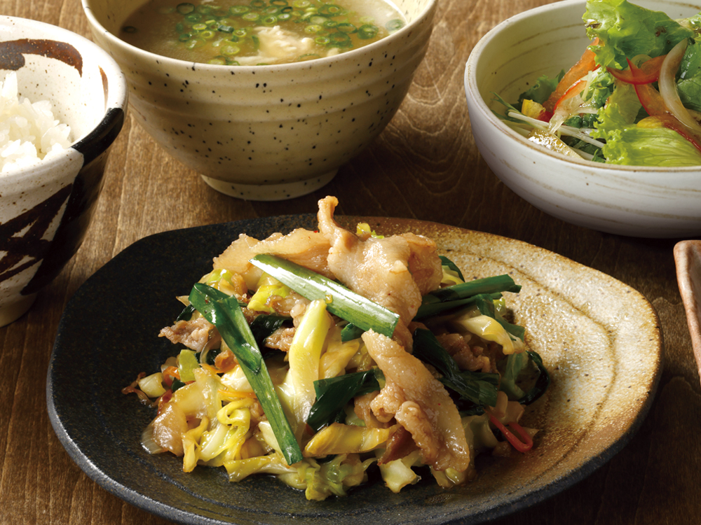 [ニラ豚・ご飯・鶏ガラスープのお味噌汁・サラダ・お新香]