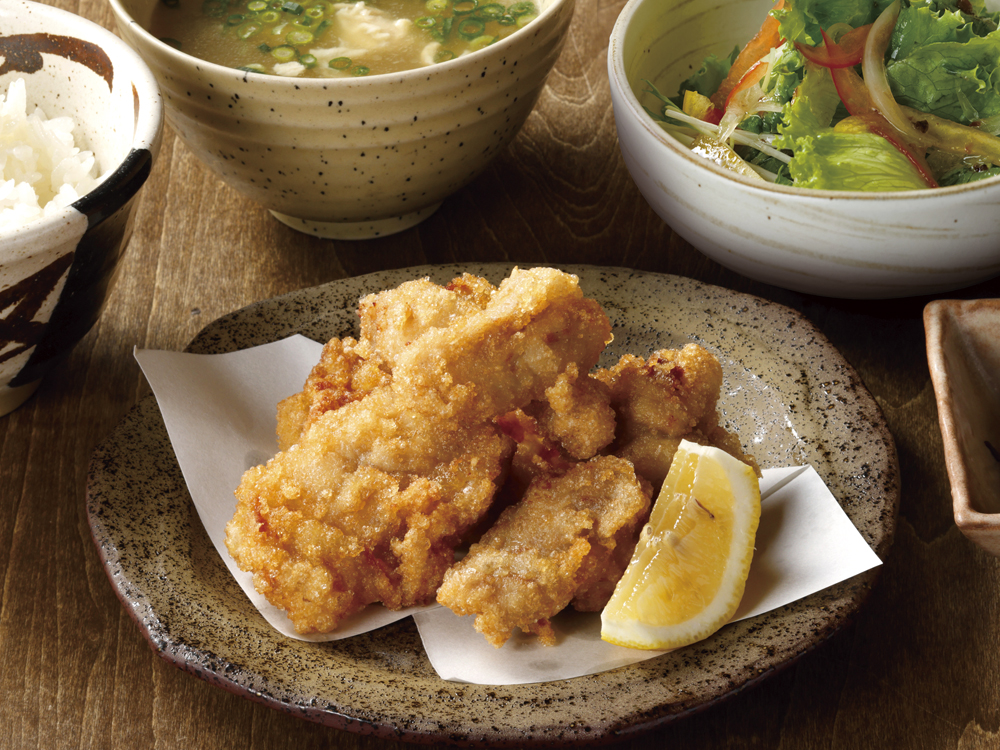 [唐揚げ・ご飯・鶏ガラスープのお味噌汁・サラダ・お新香]