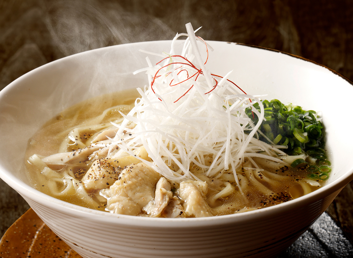 特注の平打ち玉子麺が特別感を演出し、麺が泳ぐ黄金色のスープは冠地鶏のガラに門外不出の特製タレを加え、じっくり時間を掛け煮込んだもの。
