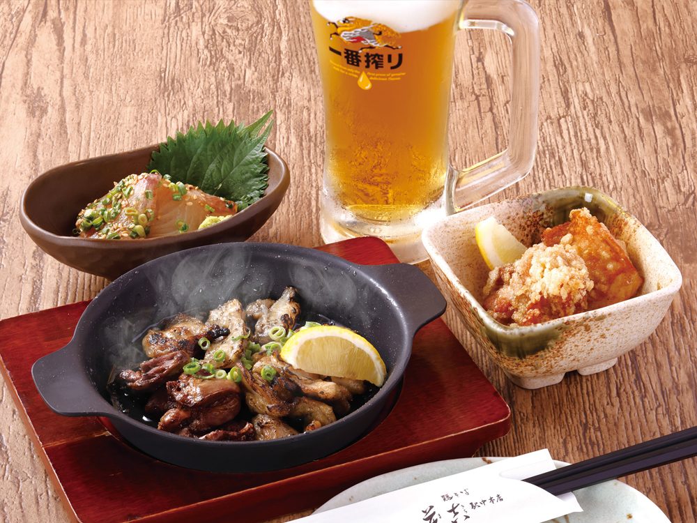 [鶏炭火焼き三種盛り・りゅうきゅう・若鶏の唐揚げ+生ビール]